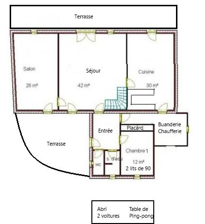 • Deux terrasses, salon de jardin, bains de soleil, barbecue, abri de voiture, table de ping pong, portique.